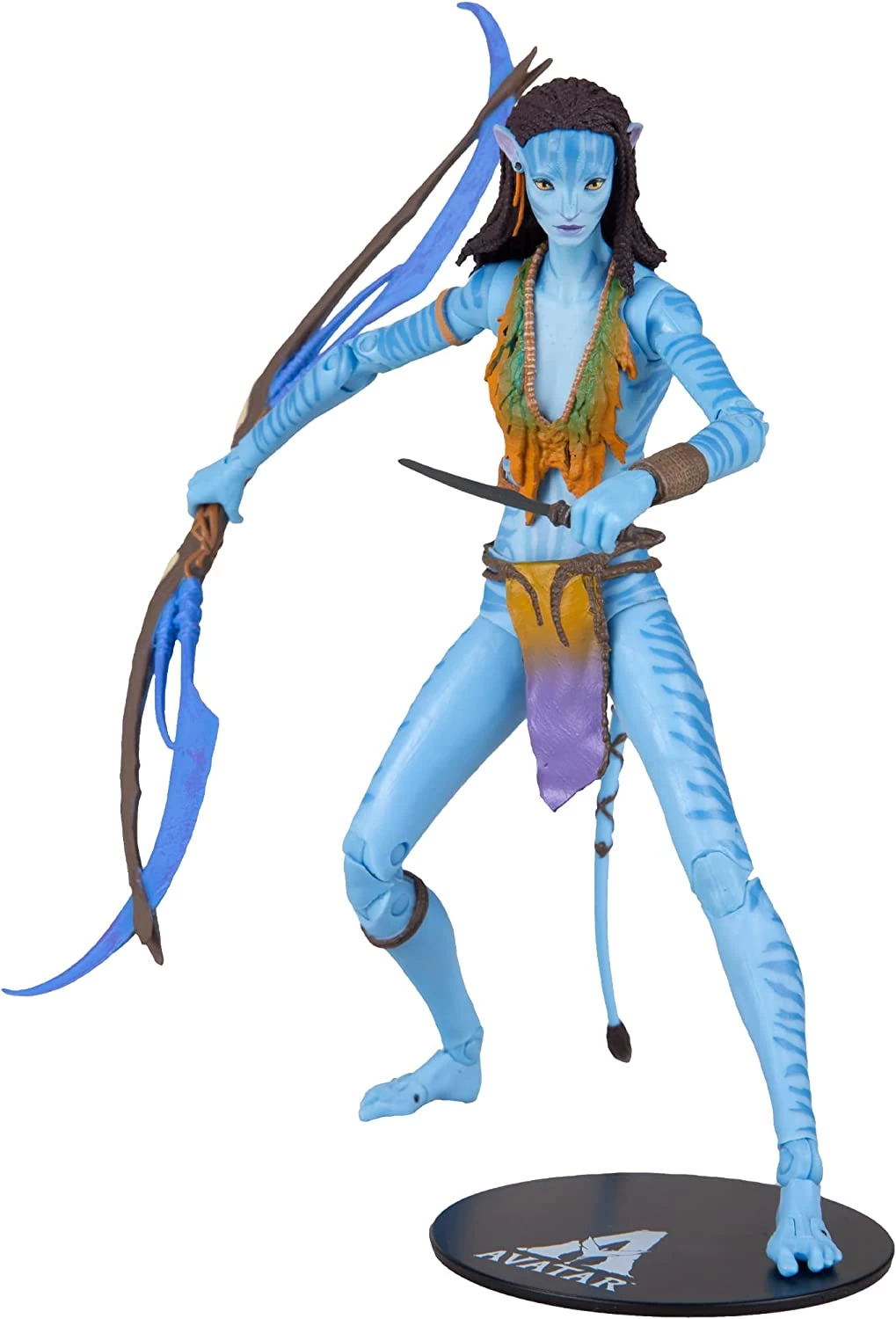 The powerful Omatikaya Na’vi warrior Neytiri returns to protect her home and her family in Avatar: The Way of Water. This incredible fully articulated, 7-inch action figure features 22 points of articulation, premium sculpt and deco, Eytukan’s bow, knife, collector stand, plus special blacklight-activated bioluminescence.