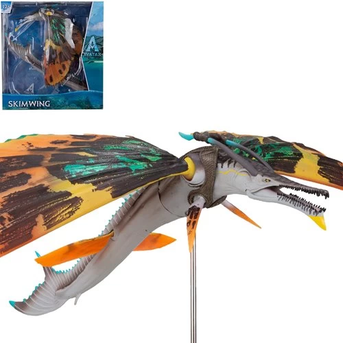 Similar to the Banshee with its sleek body and colorful wings, the Skimwing is Pandora’s large flying fish. It possesses menacing, needle-like teeth and a long snout allowing it to scoop smaller fish out of the water while in motion. Fully articulated with an incredibly high level of detail, this Mega Skimwing can be posed to swim or fly as seen in the film Avatar: The Way of Water and works with 7-inch Na’vi figures as riders. It also features an articulated jaw, poseable wired tail, bioluminescent effect when placed under black light, and special collector stand to display your incredible Skimwing!