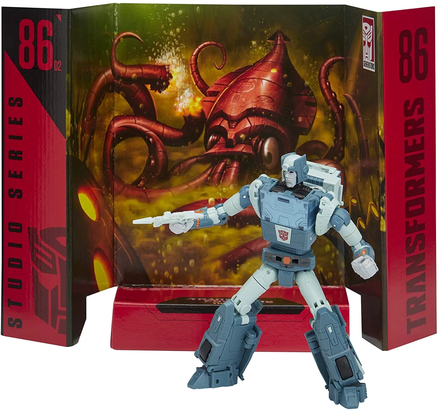 Figure scale reflects the character’s size in the world of The Transformers: The Movie. Figure and packaging are inspired by the iconic Sea Squid Showdown scene. Figure comes apart in pieces to recreate the classic battle with the giant robot squid from the movie