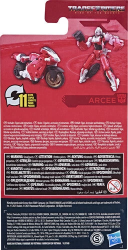 Studio Series Transformers toys are collectible action figures for 8 year old boys and girls that feature movie-inspired details and accessories. Convert the collectible action figure from robot to motorcycle mode in 11 steps and pose the Arcee toy with the included blaster accessory.